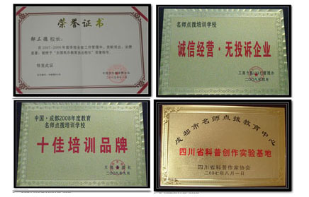 “四川省品牌教育最佳质量奖”,“全国先进学校”奖,“最强师资培训机构”奖,“质量维权•诚信企业”奖,成都培训界“四大名补”奖,“成都‘培训大业’推动培市发展标竿学校”奖,“中国个性化教育十大领军品牌” , “中小学个性化教育品牌机构”